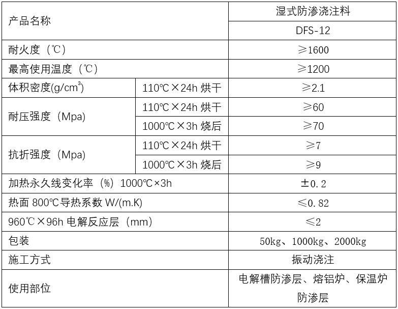 濕式防滲澆注料是鋁電解槽、鋁熔池、鋁保溫爐等不可 缺少的筑爐防滲材料,由本公司開發(fā)的DFS-12型防滲耐火澆注料是一種低水泥澆注料,它具有較高的強度,較低的顯氣孔率和較小的平均孔徑,施工時較少的用水量。在使用過程中,能與鋁液反應(yīng),形成玻璃體履蓋層,具有優(yōu)良的抗?jié)B性能。